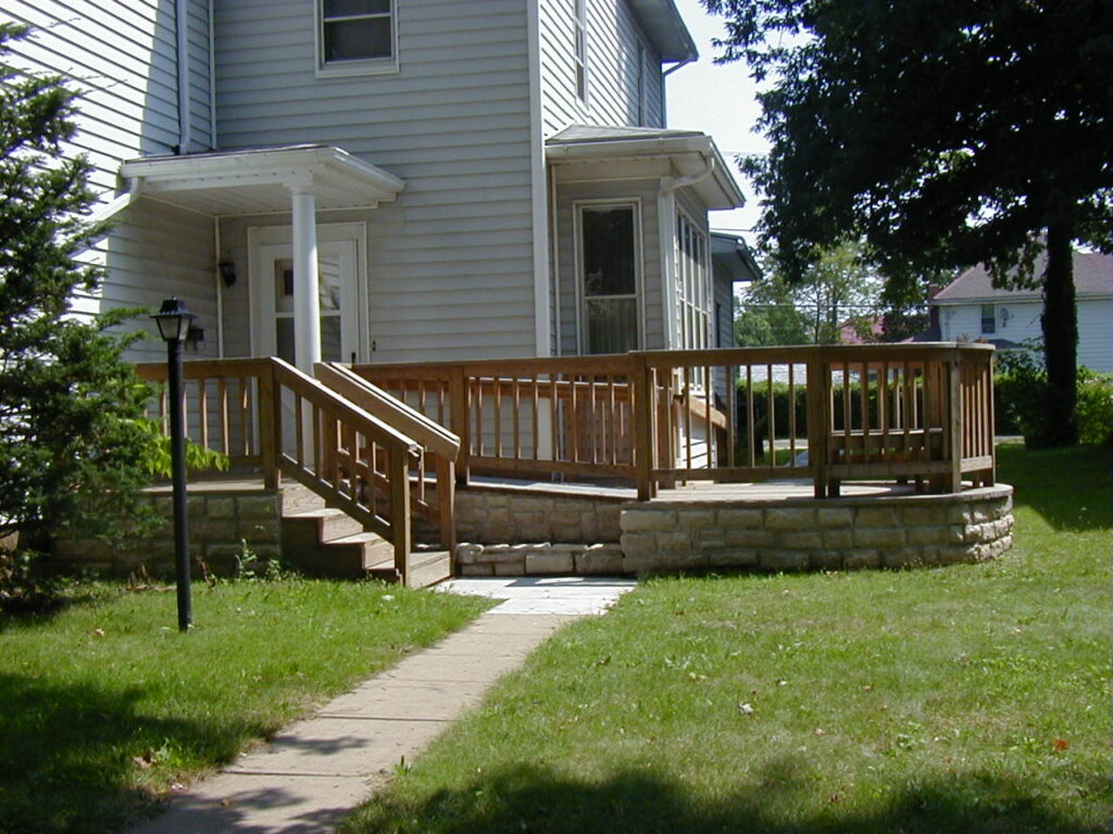 In 1998-1999, HDC completed ADA improvements to a group home in Newark for the Ohio Department of Developmental Disabilities (now Ohio Department of Behavioral Health) and Newark Resident Homes. The project consisted of dividing a large room on the first floor into an accessible bedroom and bathroom along with adding a wheelchair ramp to the first floor. The original plan was for a simple ramp from the rear parking lot to a new door in the dining room bay window. The facilities manager did not like the idea of giving up the bay window and also noted that many residents were picked up at the front door, not the parking lot. HDC design a new ramp to a new deck at the front door with a seating area at the ramp landing.