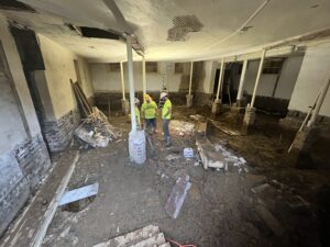 L: Wolf Creek Contracting rigged up a conveyor system to remove mud and bricks from the basement. R: Water in the basement after another heavy rain slowed construction progress.