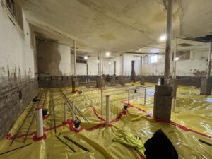 When Intel decided to build a plant in Ohio, one of the reasons is the abundance of water. Apparently, data centers keep getting built here for the same reason. But it you are working on an old building with a basement, all that water can be a liability! At The Gardner House, Steller Construction finished installing the underpinning, new concrete slab floor, and exterior perimeter drain when a torrential downpour saturated the site. Rain came down so fast that the drainage system couldn’t get water out fast enough to prevent it from entering the basement. One solution is to add a drainage mat on top of the waterproofing to keep water off the exterior wall and direct it down to the drain pipe.