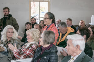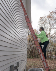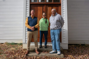 Left: Charissa Durst climbing into the attic during the final punch inspection on 11/7/2025. Center: Contractor Dan Mullins (left) and project manager Lacy Ward (right) with Charissa Durst on the church stoop after the punchlist. Right: Charissa Durst standing at the Jubilee celebration.  All photos by Jason Lucas.