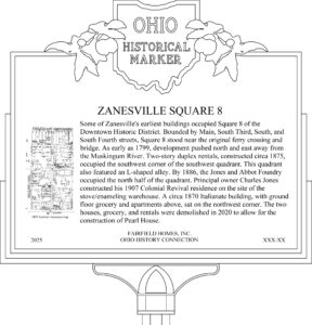 The Ohio History Connection’s marker approval process simply involves approving text not to exceed a specific word count and images of a specific size. However, the City of Zanesville required graphics showing exactly what the sign would look like, so HDC traced the outline of a historical marker in AutoCAD and mocked up the text and image for both the Zoning and Building permits, which were received in November 2025. The marker application was signed soon after and we are waiting on a proposed delivery date.