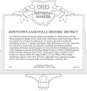HDC was successful in getting the Downtown Zanesville Historic District listed in the National Register of Historic Places in 2024, but one final piece of mitigation remained outstanding: the Ohio historical marker. Ohio historical markers started in the 1950s, born from the 1953 state sesquicentennial, to document important people, places, and events, with the first marker placed in 1957 for Akron’s Portage Path, all managed by the Ohio History Connection (formerly the Ohio Historical Society) to tell community stories through Ohio-shaped signs. The program, run on an annual cycle with sponsor-funded markers, now boasts over 1,700 markers, including special ones for the Bicentennial and LGBTQ+ history, making Ohio’s past accessible.